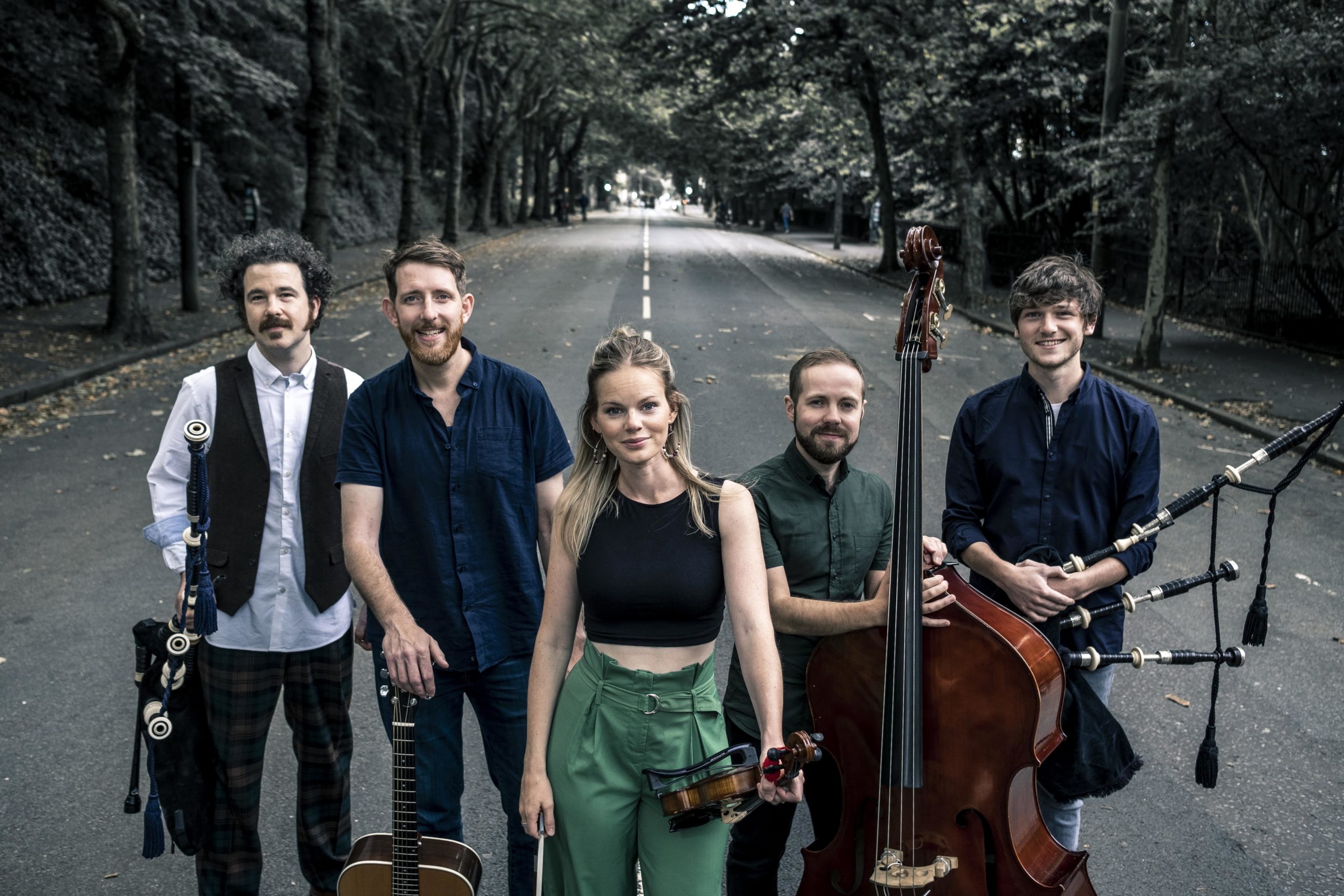 Breabach are; Megan Henderson (Fiddle, Vocals, Step Dance), James Lindsay (Double Bass, Moog, Percussion, Vocals), Calum MacCrimmon (Highland Bagpipes, Whistle, Bouzouki, Vocals), Conal McDonagh (Highland/Uilleann Bagpipes, Whistle, Flute, Vocals) and Ewan Robertson (Acoustic/Electric Guitar, Vocals, Cajon).